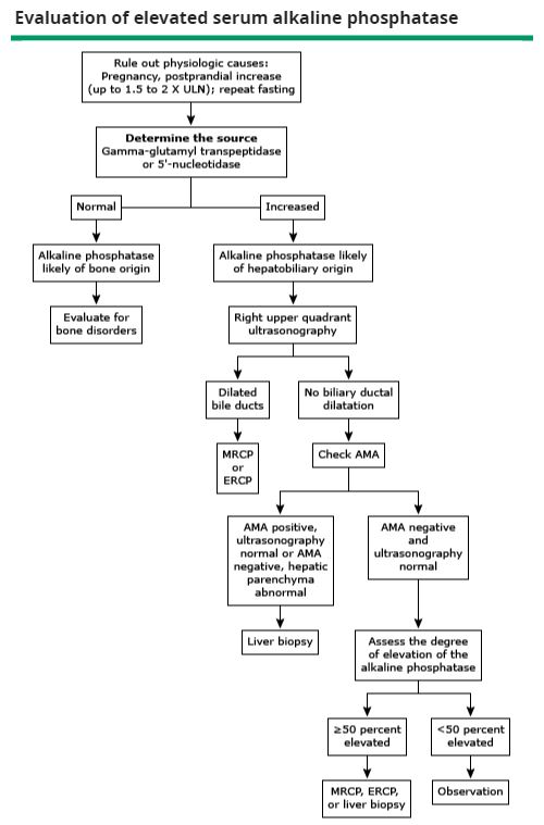 To confirm that an isolated elevation in the alkaline phosphatase is coming from the liver, a GGT level or serum 5'-nucleotidase level should be obtained. These tests are usually elevated in parallel with the alkaline phosphatase in liver disorders but are not increased in bone disorders. An elevated serum alkaline phosphatase with a normal GGT or 5'-nucleotidase should prompt an evaluation for bone diseases.